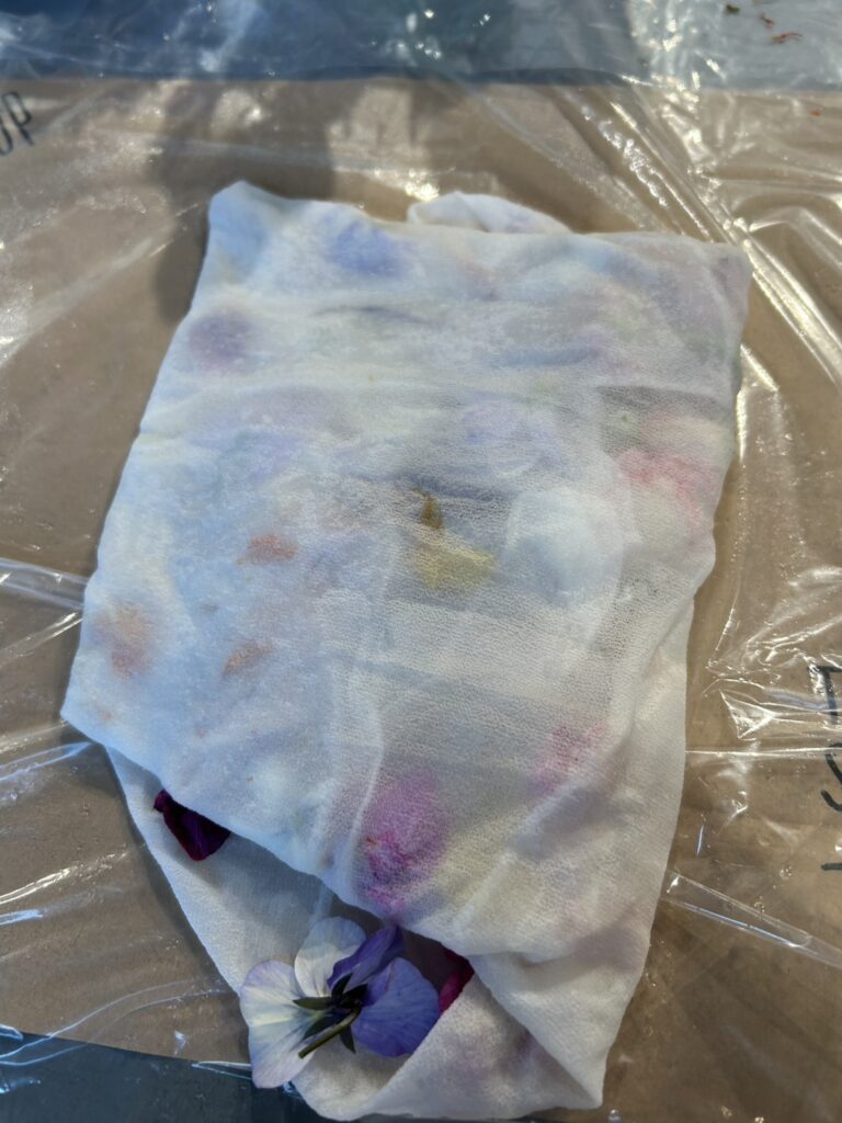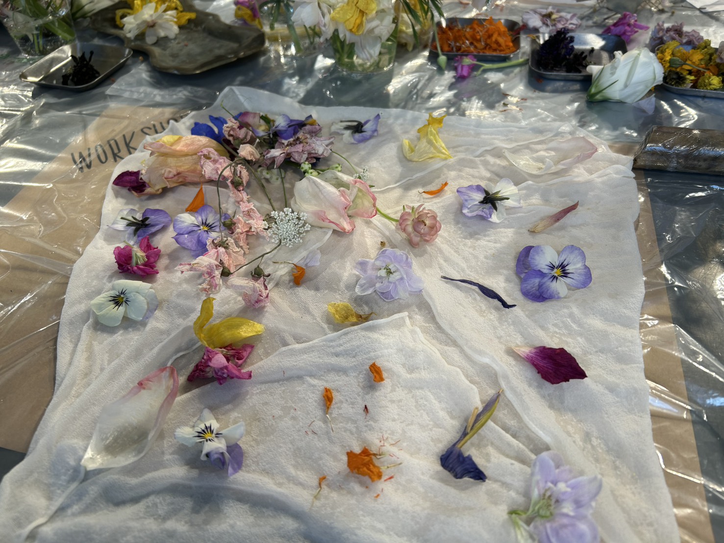 ①お花を選んで、濡れたスカーフに置く 家で咲いてるスミレも持ってきて置いてみた♪